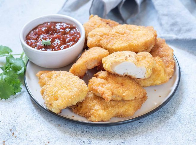 Pollo, ternera con base vegetal, salsa acompañado patatas fritas